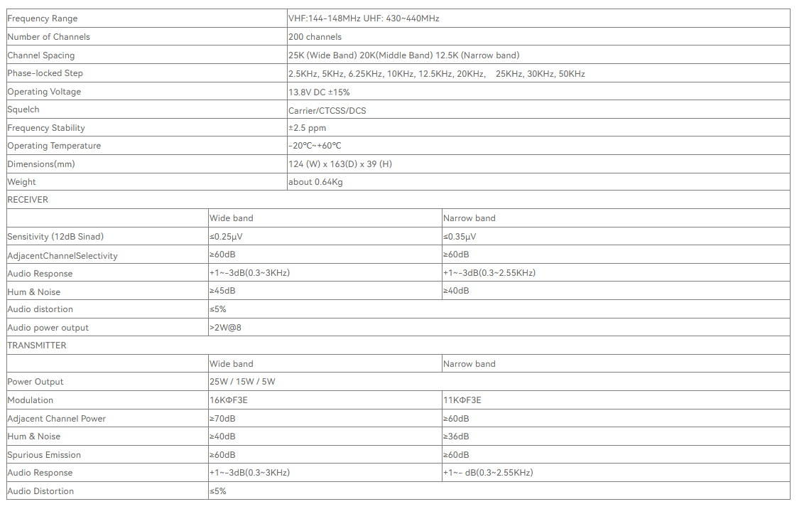 Configuração separada de CTCSS, DCS, DTMF e 5Tone para cada canal, rejeitando chamadas extras de outros rádios.