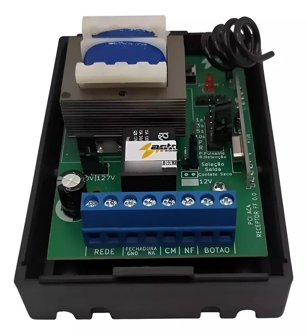Utilizado para acionar fechadura elétrica ou trava eletroima atraves de botoeiras e ou controle remoto.