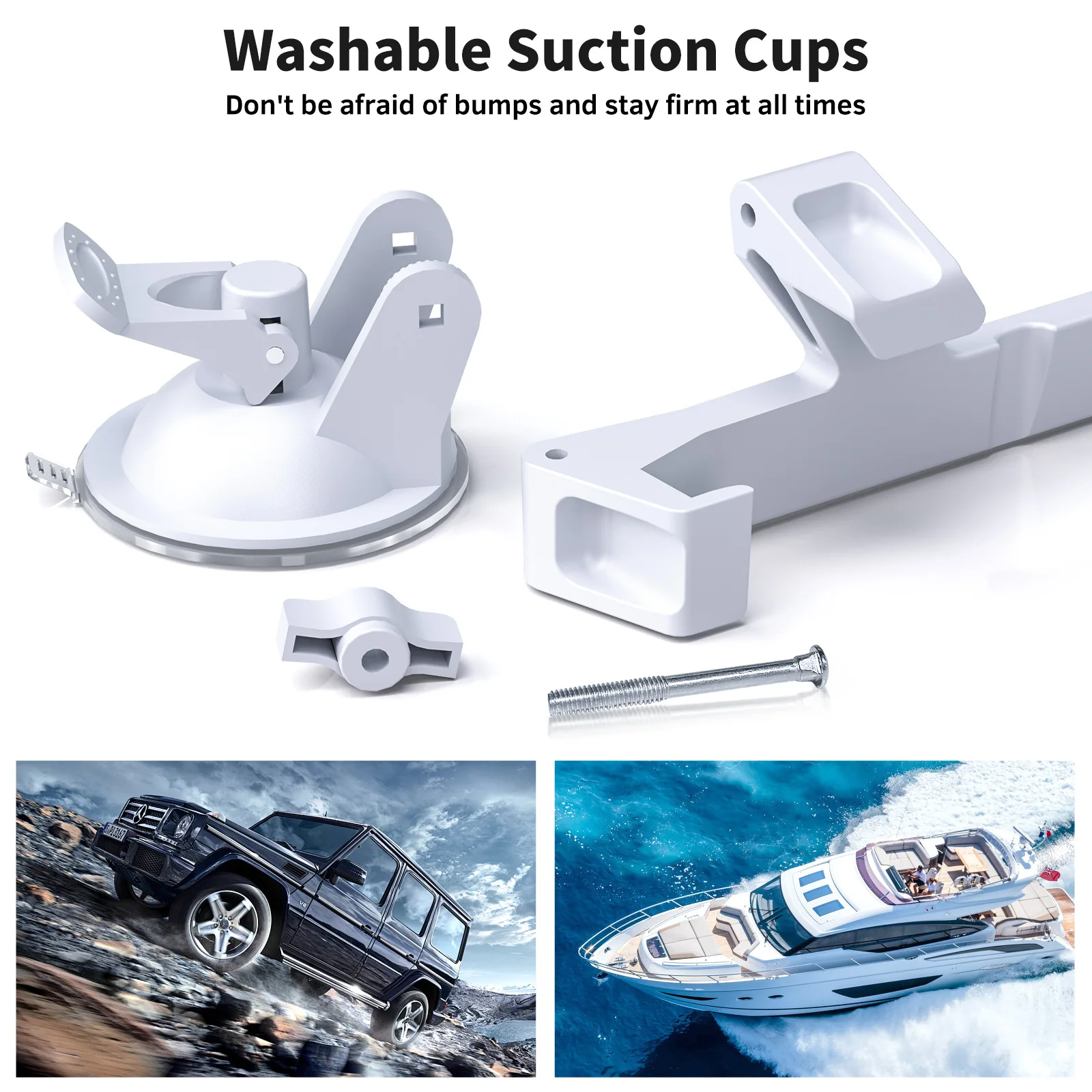 Material: Plástico resistente e borracha para ventosas